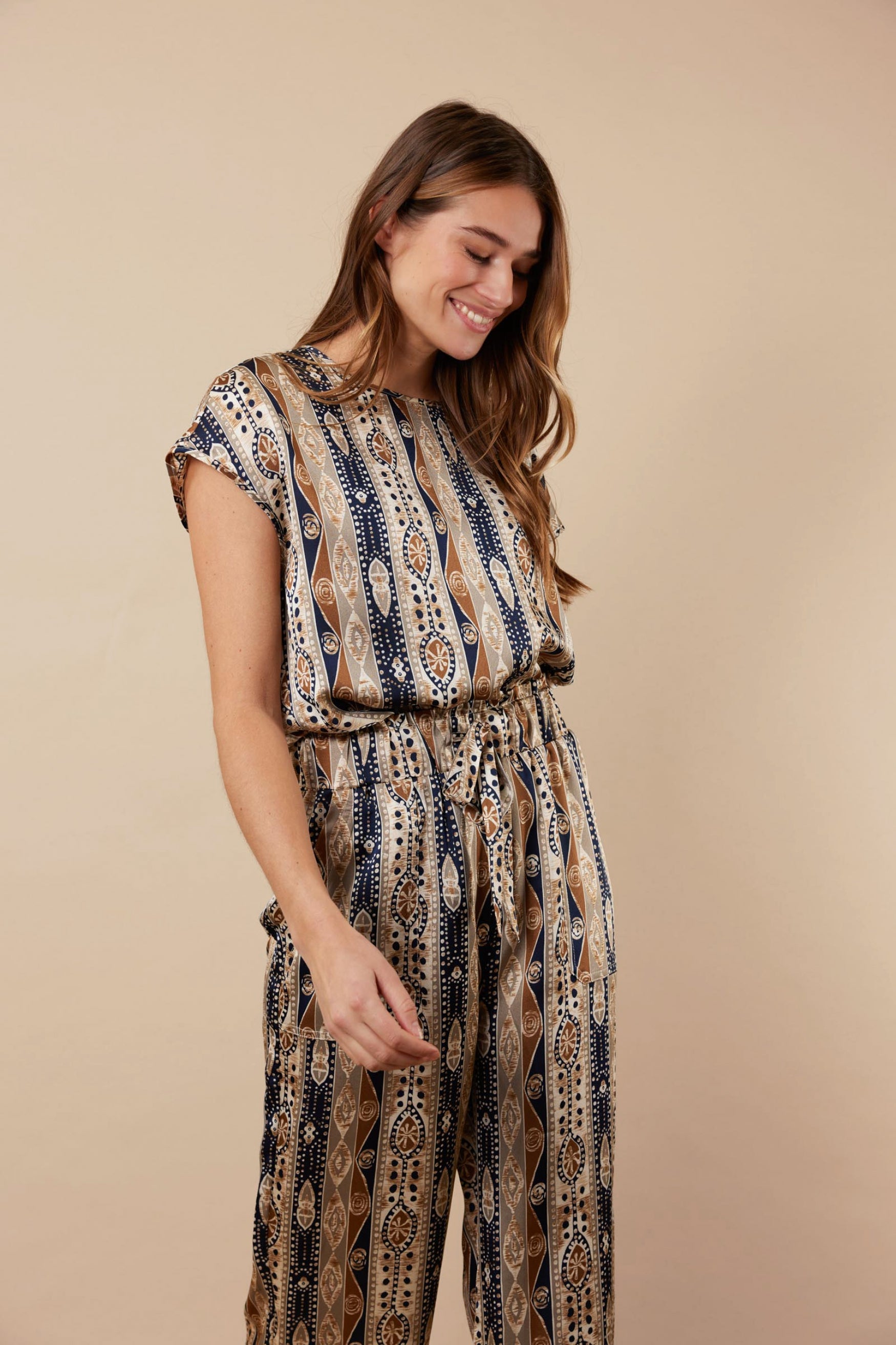 De Alyssa broek is gemaakt van crêpestof en heeft een aansluitend model met wijdlopende broekspijpen. De broek is voorzien van steekzakken en een elastieken tailleband. Combineer de Alyssa broek met de Ainoa top voor een complete set.