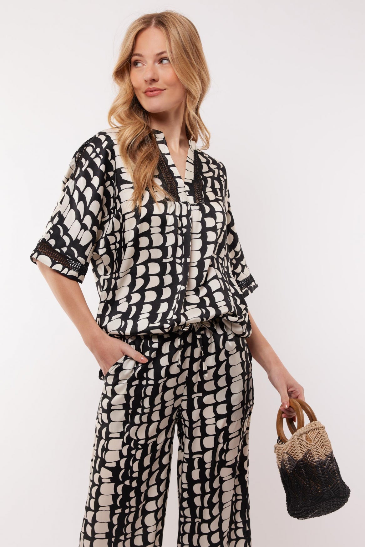 De Bo-anne broek heeft een comfortabel, recht model met losvallende broekspijpen. De broek is voorzien van steekzakken en een striksluiting in de tailleband. De broek heeft een abstracte print en kan als set gestyled worden met de Bibe top.