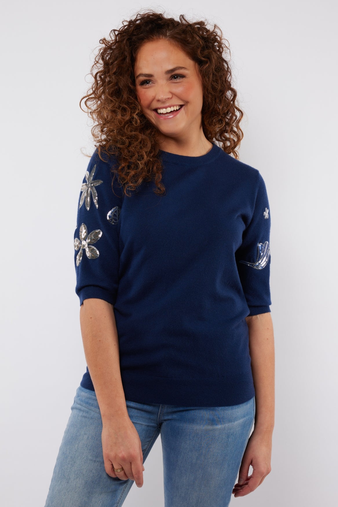 Het model is 172 cm lang en draagt een maat S.