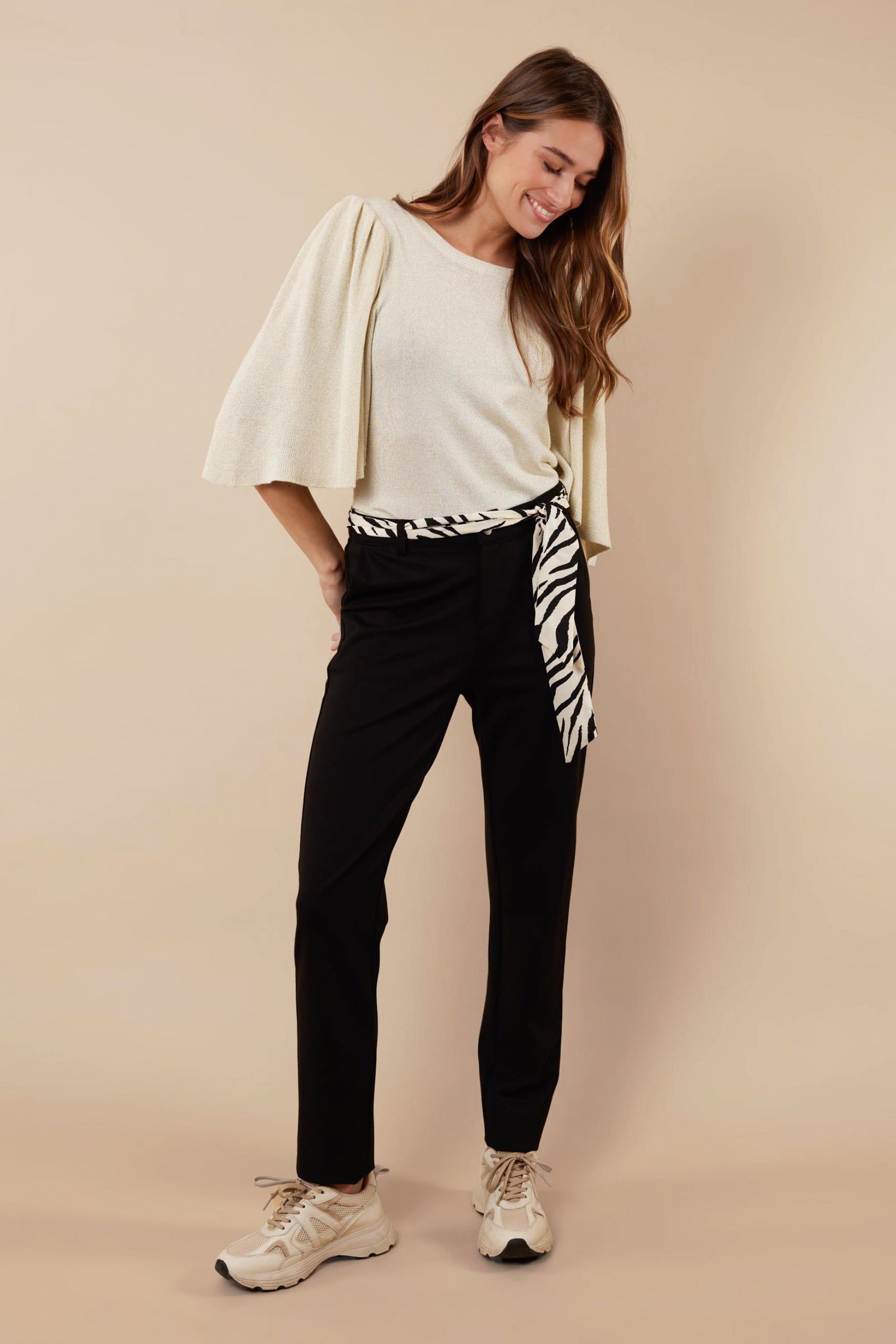 Geef je look een chique touch met de Amalia top. Deze top heeft een aansluitend model met een ronde hals en speelse plooimouwen. De top is voorzien van een subtiele glinstering.